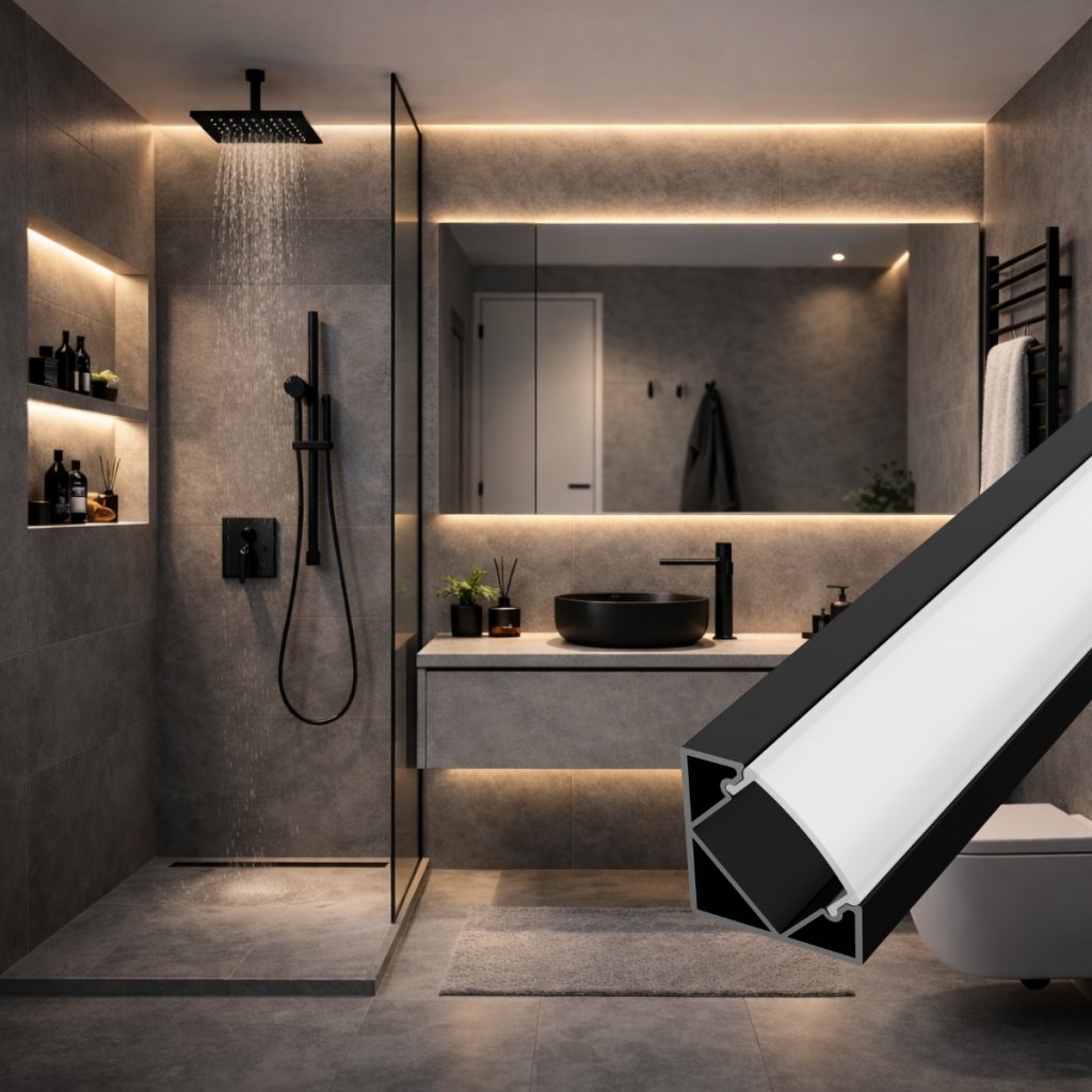 Perfect for kitchen under-cabinet lighting, shelves, display cases, and drywall installations. The Corner 1 profile provides a 45° light angle, ideal for illuminating work surfaces or highlighting architectural details with a clean and modern look.
