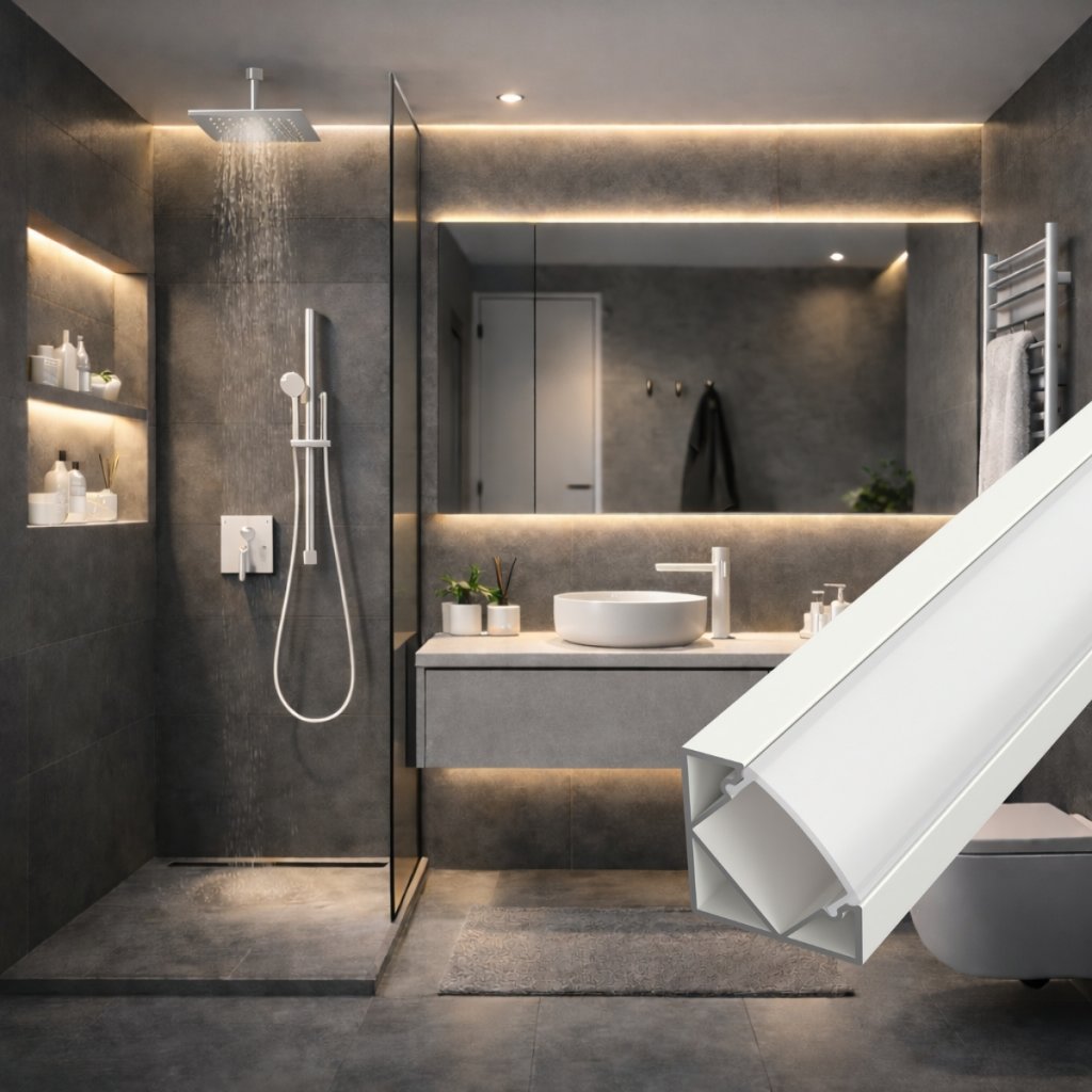 Perfect for kitchen under-cabinet lighting, shelves, display cases, and drywall installations. The Corner 1 profile provides a 45° light angle, ideal for illuminating work surfaces or highlighting architectural details with a clean and modern look.