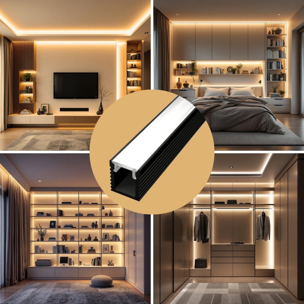 The Slim SURFACE profile is perfect for installations where space is limited and clean design is essential. It can be used for under-cabinet lighting, recessed furniture lighting, accent illumination in 3D wall slats, or integrated into decorative elements and moldings. Thanks to its compact size and elegant finish, it fits seamlessly into modern interiors, both in residential and commercial spaces.
