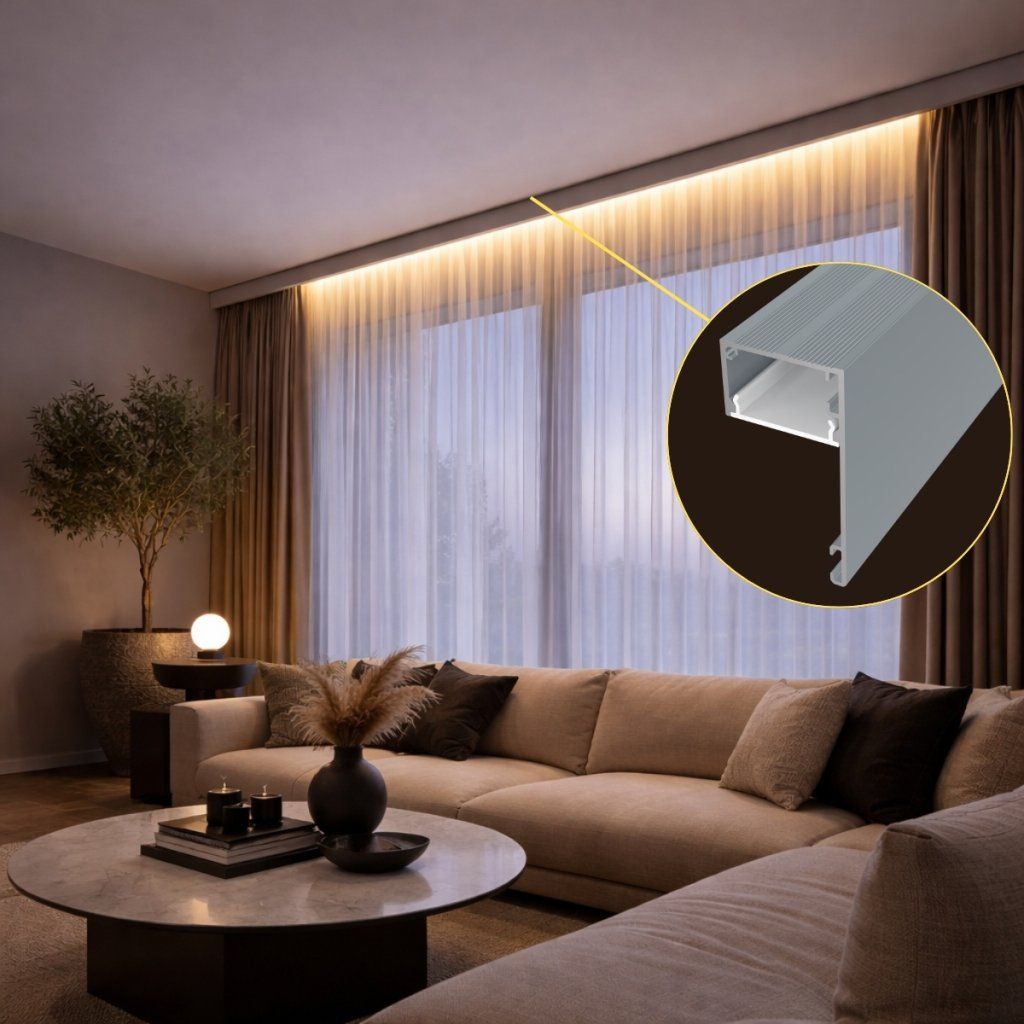 The profile is ideal for use as a curtain track profile, where it creates soft backlighting for curtains or drapes and highlights their texture and movement. The light gently flows over the fabrics, creating a pleasant atmosphere, especially in living rooms and bedrooms.