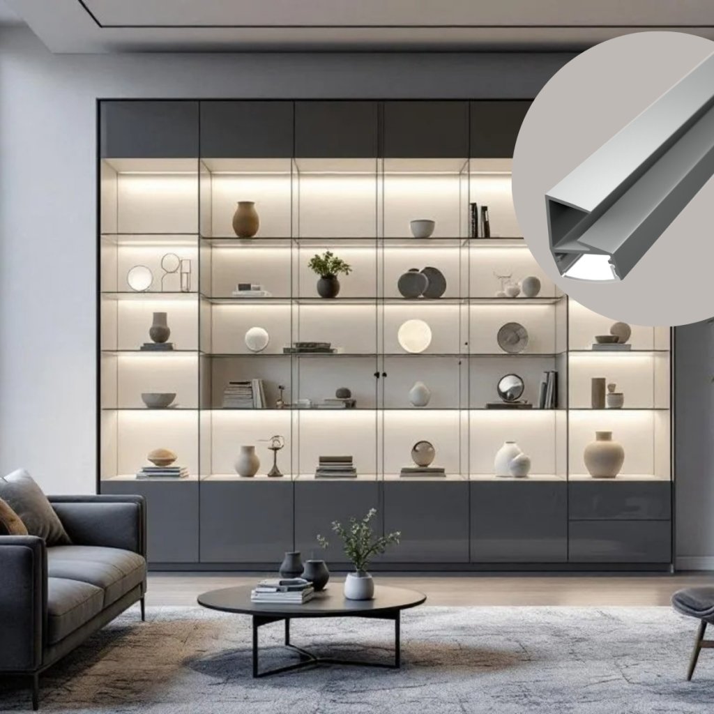 The GLASS SHELF profile is ideal for lighting glass or thin shelves in furniture, display cases, and cabinets. It is most commonly used in living rooms, kitchens, bathrooms, retail spaces, and showrooms, where discreet lighting enhances the appearance of displayed items. Thanks to its 20° beam angle, it provides soft, indirect illumination without glare, adding a touch of elegance to any interior.