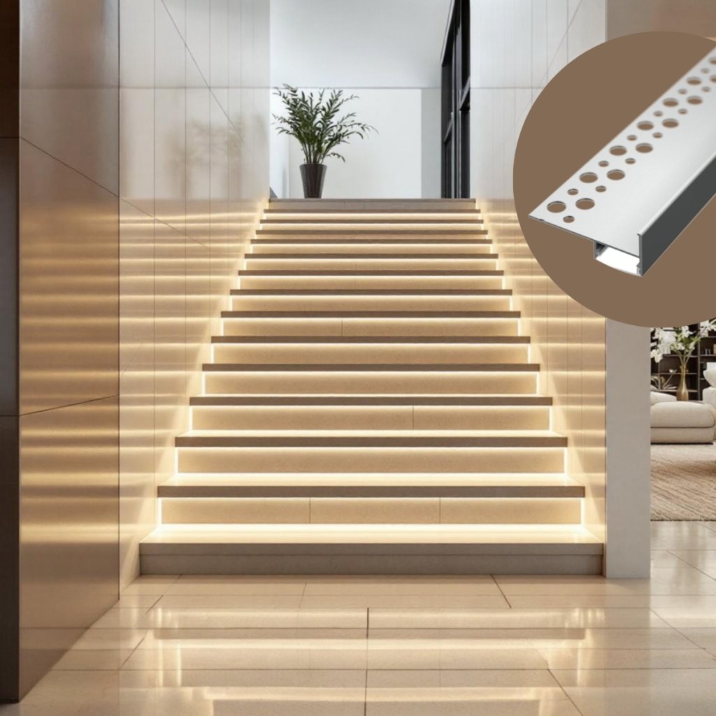 The TILE-EDGE profile is ideal for creating subtle and elegant lighting on stairs. It is most often used as front-edge illumination on tiled steps, providing under-step lighting in residential, commercial, or hospitality interiors. Thanks to its ability to integrate seamlessly under tile finishes, it enhances both safety and design. It is also suitable for use with motion sensors for automatic illumination and works perfectly in minimalist spaces where integrated lighting solutions are preferred.