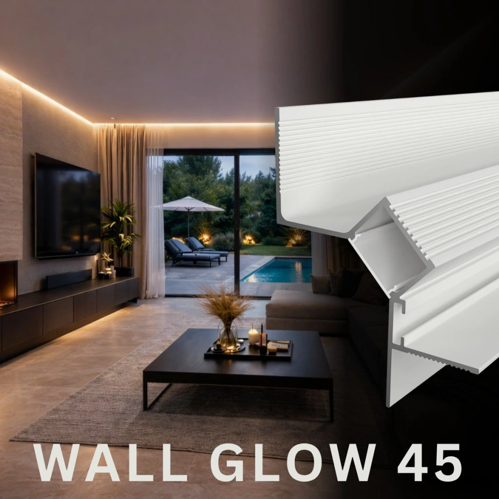 The LED profile WALL GLOW 45 is designed for precise, indirect lighting that enhances walls without exposing the light source. Built for side mounting into drywall, it creates a clean recessed effect along the perimeter of the space.