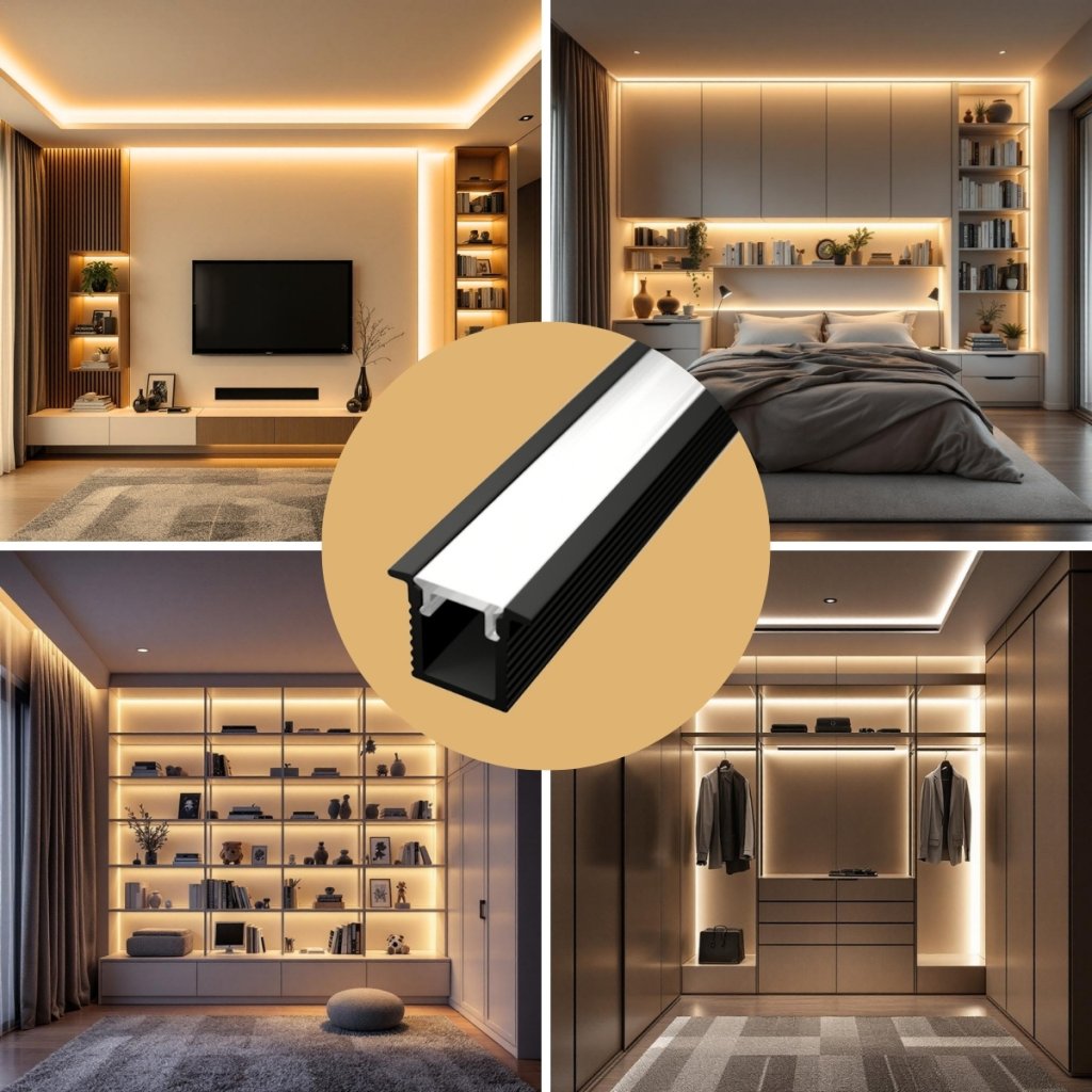 The Slim RECESSED profile is ideal for subtle lighting applications where a seamless and integrated look is essential. It is commonly used in wooden furniture, shelves, drawers, cabinets, and decorative wall panels. Thanks to its ultra-slim design and flush installation, it blends perfectly into modern interiors, providing discreet and elegant illumination.