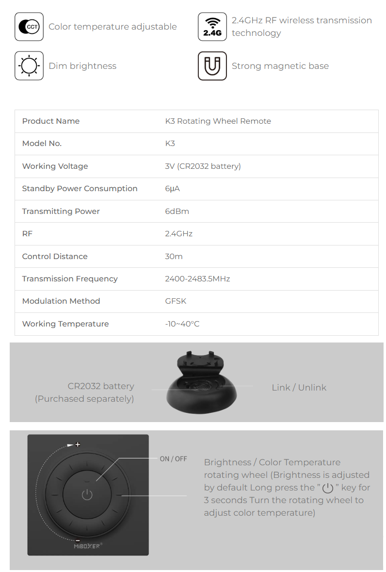 Dual White (CCT) Rotating Wheel Mini Remote (2.4GHz) Black